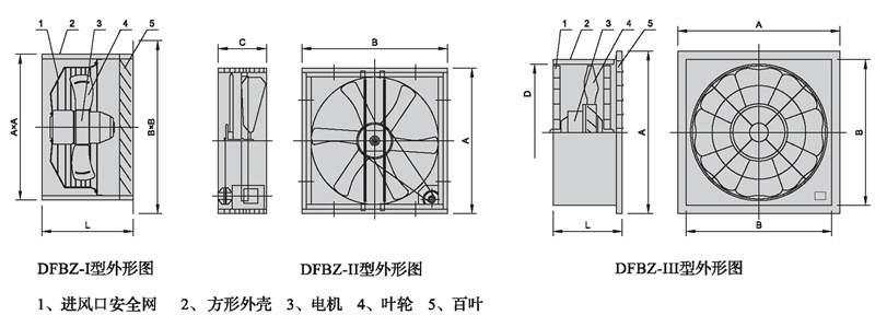 DFBZ-I型為采用內(nèi)轉(zhuǎn)子電機(jī)直聯(lián)傳動(dòng)結(jié)構(gòu)形式、DFBZ-Ⅱ型采用內(nèi)轉(zhuǎn)子電機(jī)、皮帶傳動(dòng)結(jié)構(gòu)形式,DFB-Ⅲ型為采用外轉(zhuǎn)子電機(jī)直聯(lián)傳動(dòng)結(jié)構(gòu)形式。可根據(jù)用戶要求制威防腐防爆型。